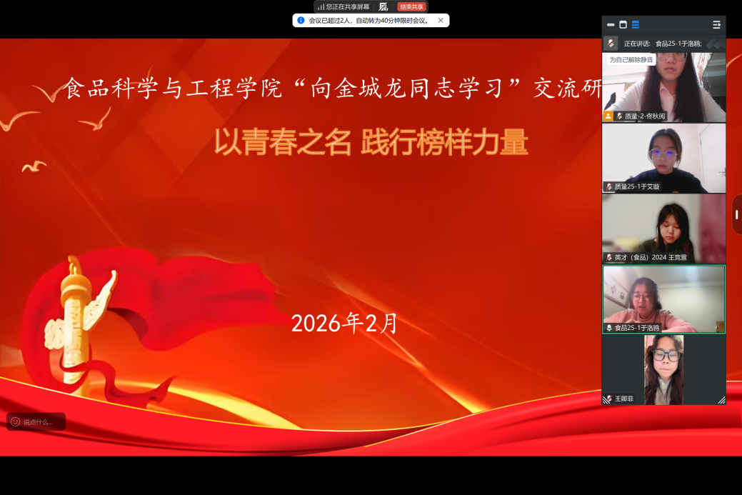 金城龙同志以生命诠释新时代青年的使命与担当,是青年学子崇德向善、勇担重任的优秀典范。为深入学习其先进事迹和崇高精神,引导全院学生见贤思齐、勇担使命,学院组织开展向金城龙同志学习活动。2月5日,全体本科生通过电视直播、网络观看等线上线下相结合的方式,同步收看金城龙同志“辽宁时代楷模”称号追授发布仪式。仪式上通过视频影像、亲友同事讲述等形式,全面回顾了金城龙同志从军报国、勤学笃行、冰河救人、无私奉献的一生,同学们在观看过程中深受触动、备受鼓舞,被英雄的高尚品格和赤诚初心深深感染。2月8日,学院召开金城龙同志先进事迹专题研讨会,组织学生骨干深入学习金城龙同志先进事迹,深刻感悟其背后蕴含的坚定信念、家国情怀和无私奉献精神。在研讨交流环节,学生代表结合自身学习、工作和志愿服务经历,分享学习感悟、畅谈践行方向。大家一致表示,将把对英雄的敬仰转化为实际行动,以金城龙同志为榜样,勤学笃行、砥砺品格,主动将个人成长融入时代发展,在服务同学、回馈社会中彰显新时代青年的责任与担当,用青春力量让英雄精神落地生根。此次学习活动,让全院学生接受了一次深刻的思想洗礼和精神淬炼。学院将以此次活动为契机,把学习金城龙同