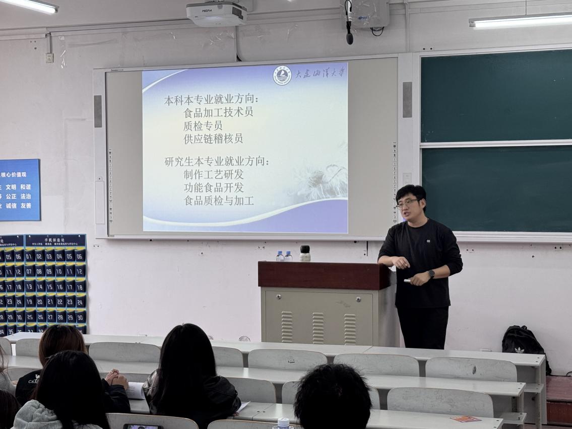 1112日,我院在獐子岛教学楼231教室举办“食代先锋”讲坛第二期暨大学生职业生涯规划专题讲座。本次讲座邀请大连交通大学教师贾宇盟老师主讲,学院党委副书记武家春、辅导员佟婧绮以及2024级全体本科生共同参与。