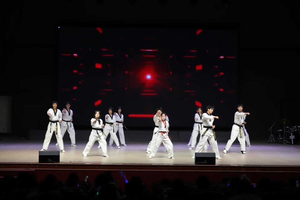 灯光聚焦,跆风乍起!搏武社的表演震撼登场,表演者身着整齐道服,眼神坚毅如炬,一招一式刚劲有力,旋风踢划破空气,连环腿利落干脆,瞬间点燃全场激情。