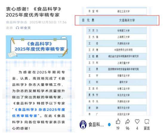 近日,食品与水产领域国内权威学术期刊《食品科学》《水产学报》分别公布年度优秀审稿人名单,我院田元勇副教授凭借高质量的审稿意见、严谨的评审态度以及高效的审稿响应,同时获评两刊的“优秀审稿人”称号。